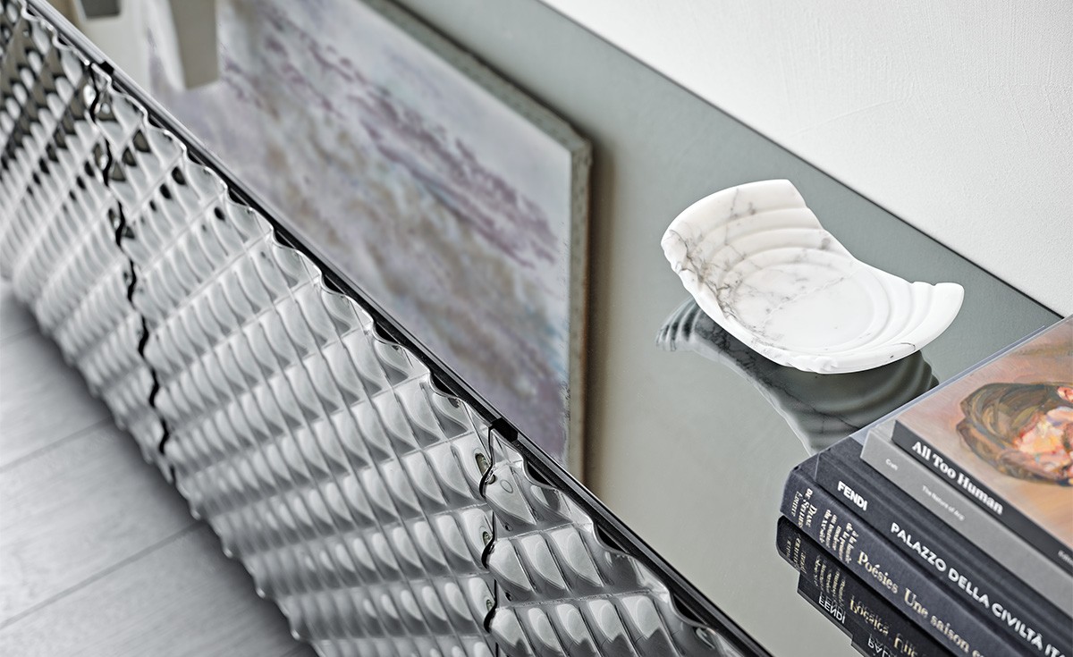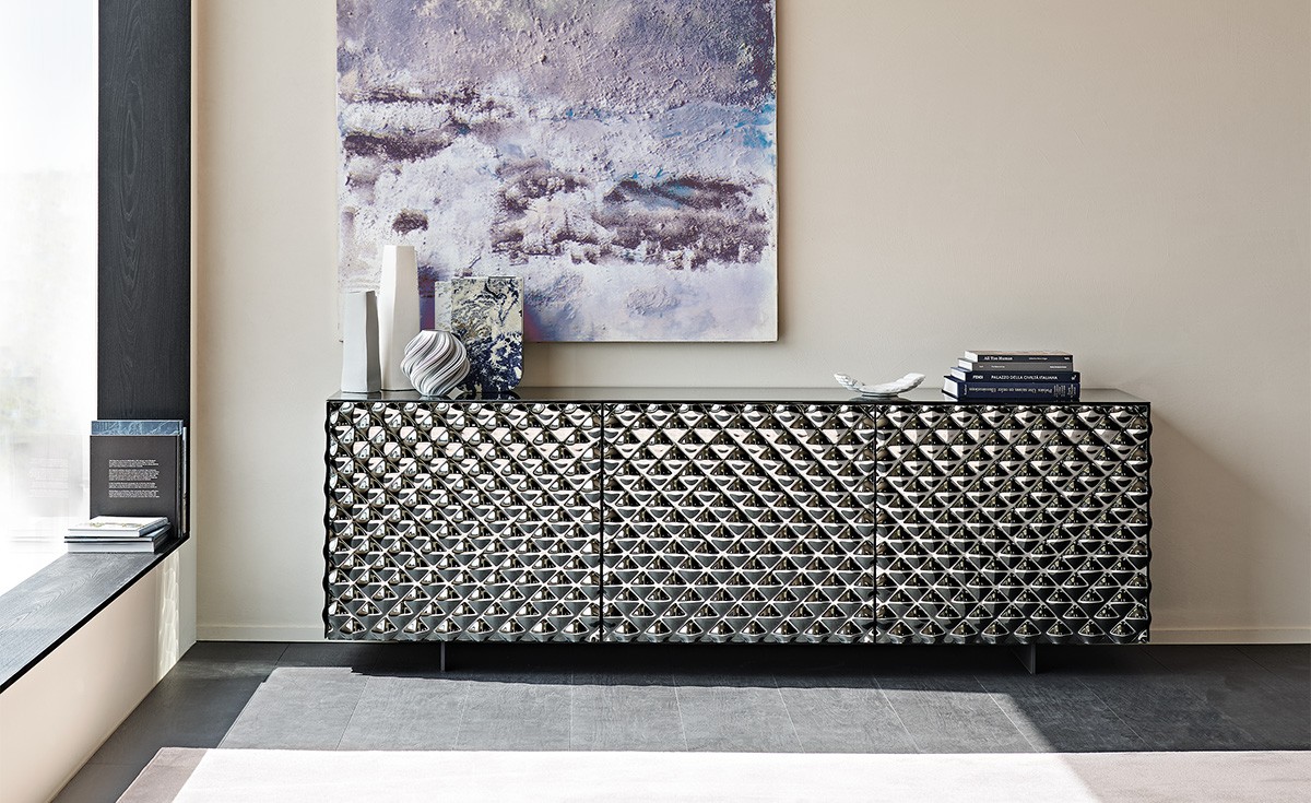 Bufet VIVALDI od Cattelan Italia to designerski kredens z lustrzanymi frontami, tworzącymi grę odbić. Unikalna technika obróbki szkła nadaje powierzchni trójwymiarowy efekt pikowania. Dostępny w różnych rozmiarach i wykończeniach.