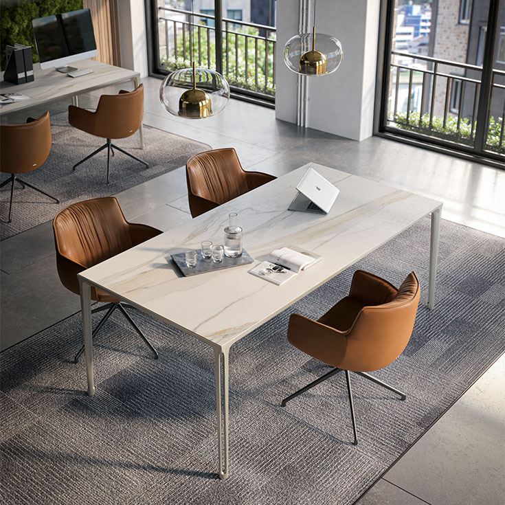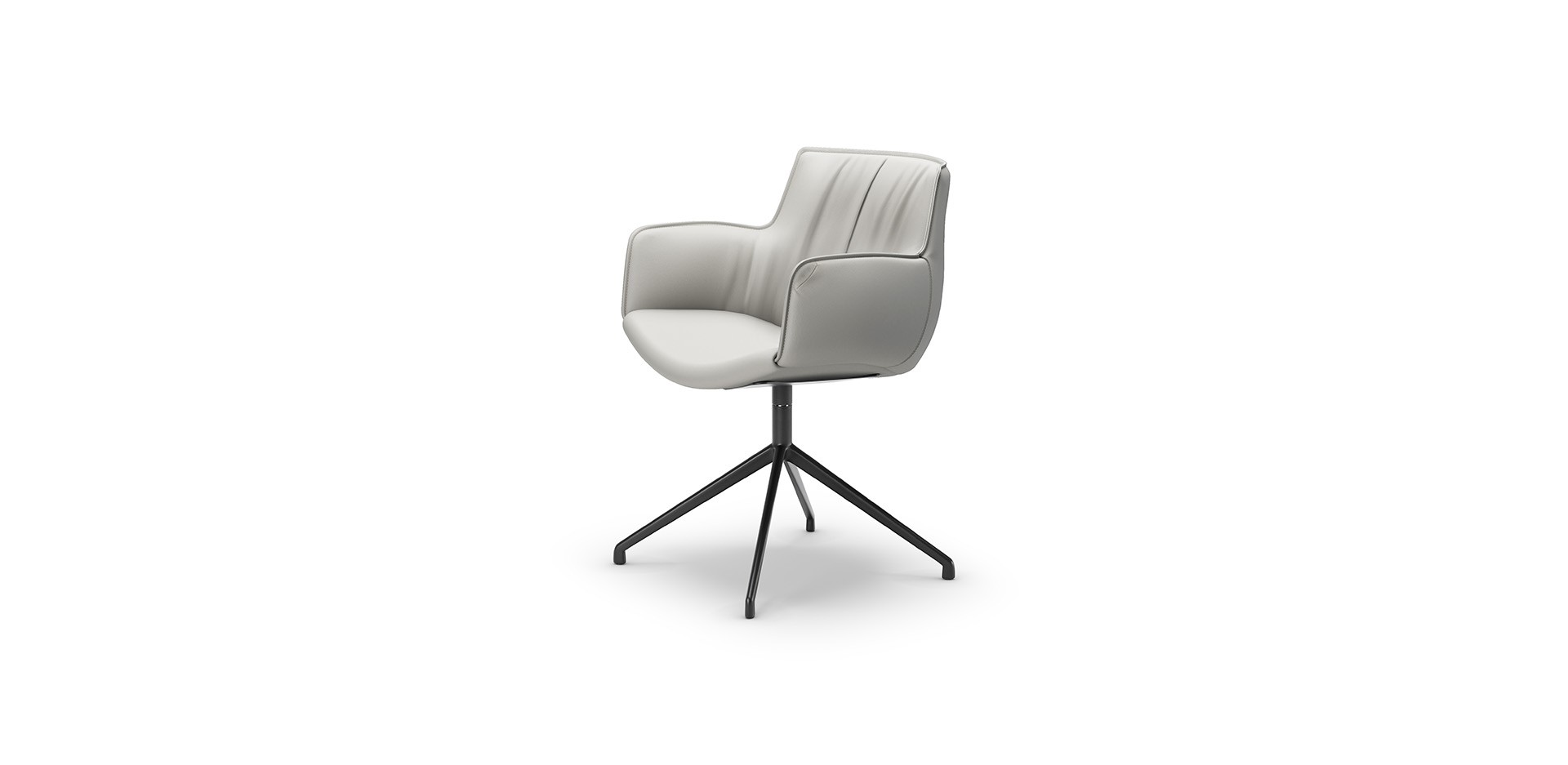 Rhonda Turn to obrotowa wersja krzesła, która sprawdzi się zarówno w przestrzeniach domowych, jak i biurowych. Czteroramienna podstawa zapewnia stabilność i swobodę ruchów. Metalowa rama dostępna jest w różnych wykończeniach, a bogata oferta tkanin i skór pozwala na idealne dopasowanie do każdego wnętrza.