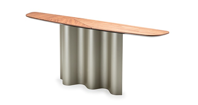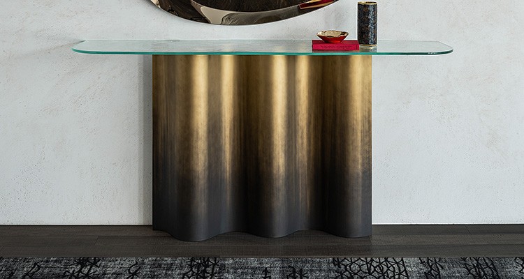 Designerska konsola Nettuno jest jednocześnie smukła i imponująca. Szczególnie efektowna jest podstawa wykończona z serii Brushed, ręcznie szczotkowana przez rzemieślników. Zakrzywiona metalowa podstawa wykonana jest z jednego kawałka, co podkreśla jakość i zmysłową sylwetkę szklanej konsoli.