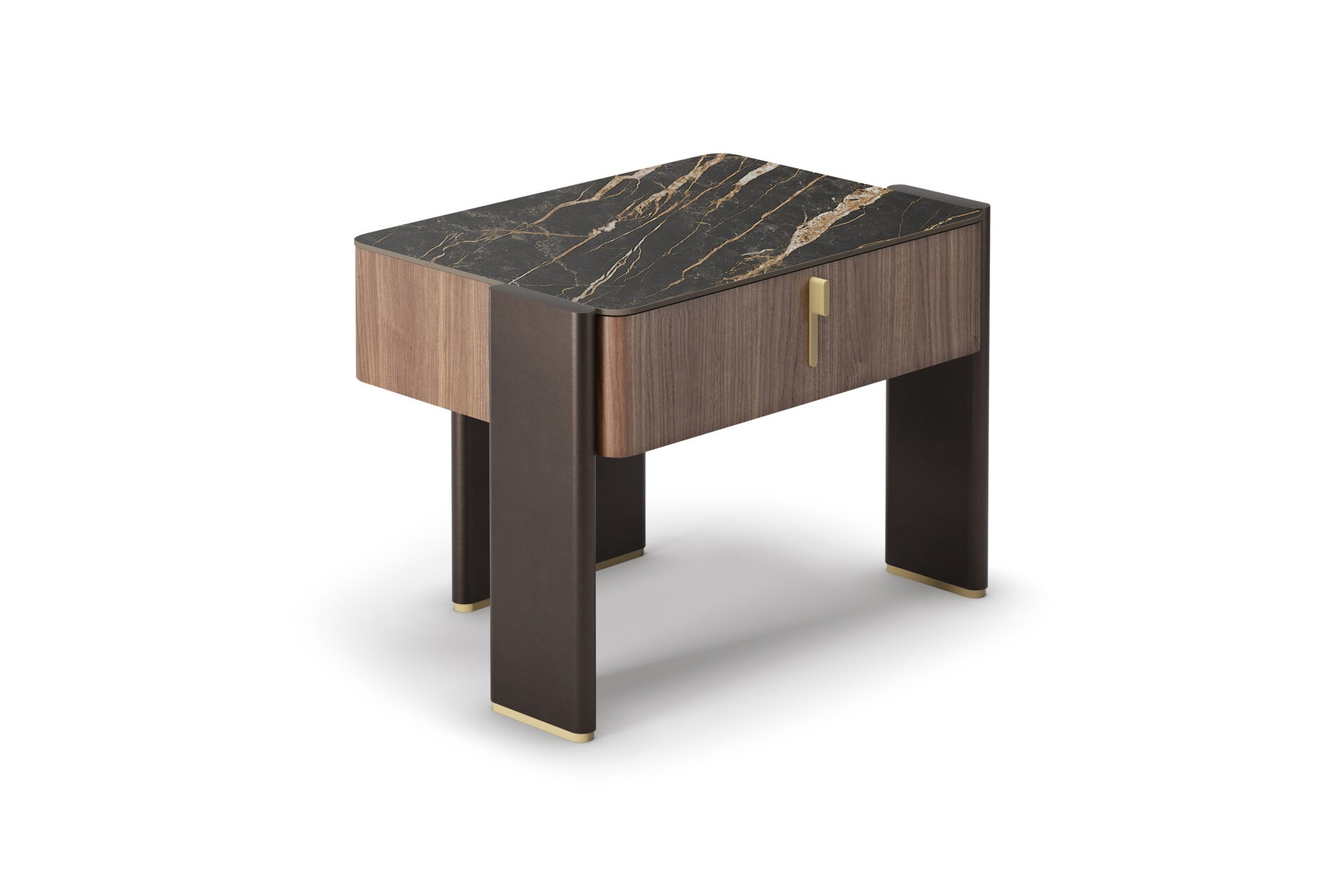 Blat wykonano z ceramiki z efektem marmuru, materiału, który stał się stylistycznym znakiem rozpoznawczym Cattelan Italia. Szeroka gama odcieni pozwala spersonalizować stolik nocny i dopasować go do indywidualnych preferencji.